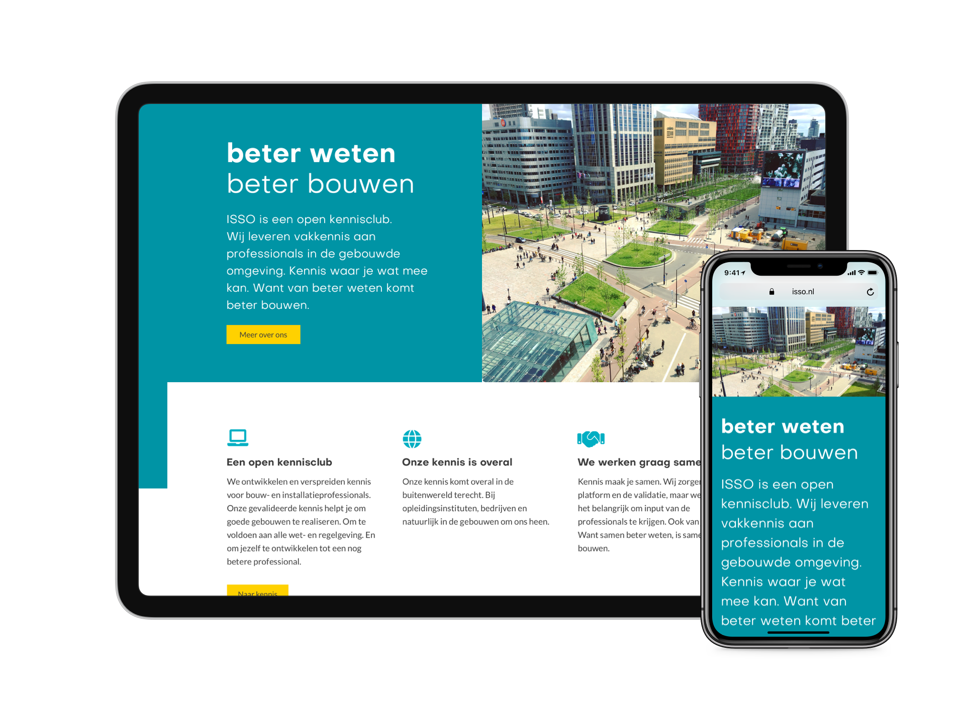 ISSO is een kennisbank voor bouwend nederland. Om deze kennis goed te delen is het belangrijk om ook partners te zoeken. Daarom hebben we ISSO geholpen met een coorporate website. Hier lag erg de nadruk op het uitnodigen om samen te werken en projecten op te starten. De essentie van ISSO hebben we daarom ook geprobeerd zo duidelijk mogelijk naar voren te laten komen boven de fold. Beter weten = Beter bouwen.