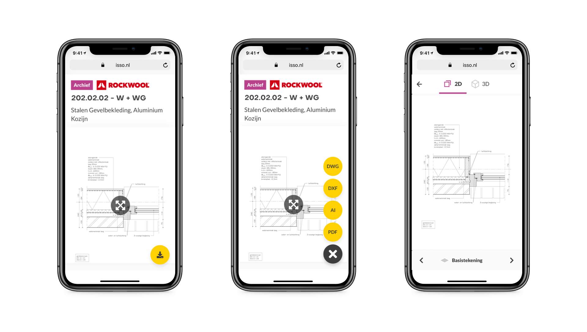 We hebben voor alle soorten content een ontwerp gemaakt. Hierboven is een mooi voorbeeld van een detail tekening. Het android design hover button pattern is hier gebruikt om een afbeelding te downloaden. Daarnaast is het mogelijk om de lagen in 2d en het in 3d te bekijken.